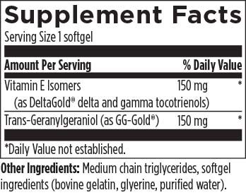 Annatto-E™ GG is a combination of two ingredients per softgel: 150 mg of annatto tocotrienols, a unique tocopherol-free, tocotrienols-only product featuring tocotrienols sourced from the annatto tree, along with 150 mg of geranylgeraniol (GG), a compound that plays critical roles in numerous biological processes affecting organs and tissues throughout the body. The tocotrienols in this product are provided as DeltaGold®, a patented tocotrienol formula from American River Nutrition, and geranylgeraniol, which is present as GG-Gold®, a patented form of GG extracted from annatto seeds.