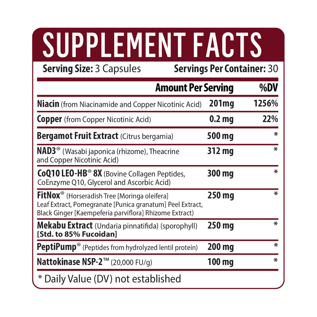 The first ingredient selected is NAD3®, a new and novel ingredient which uses a different approach to manage cardiovascular factors while having positive influences on the hallmarks of aging. NAD3® is a unique blend of Wasabi japonica extract, theacrine and copper(I)-niacin complex. It turbocharges enzymes that boost the conversion of NAD+ precursors to NAD+ while also suppressing the activity proteins that deplete NAD+. This product has been designed to help modulate inflammation and reduce lipids in our blood associated with heart disease. Compared to placebo, at a dose of 312mg daily, NAD3® lead to significant changes in multiple cardiovascular risk factors (-19%VLDL, -16%LDL, -12%Tot Chol) with a safe, well-tolerated dietary supplement that also demonstrated multiple additional benefits related to healthy aging and cellular longevity. NAD3® may improve NAD+ status by supporting its synthesis and limiting its degradation, in addition to activating the downstream signaling pathways of longevity, while minimizing the chronic stress of aging.