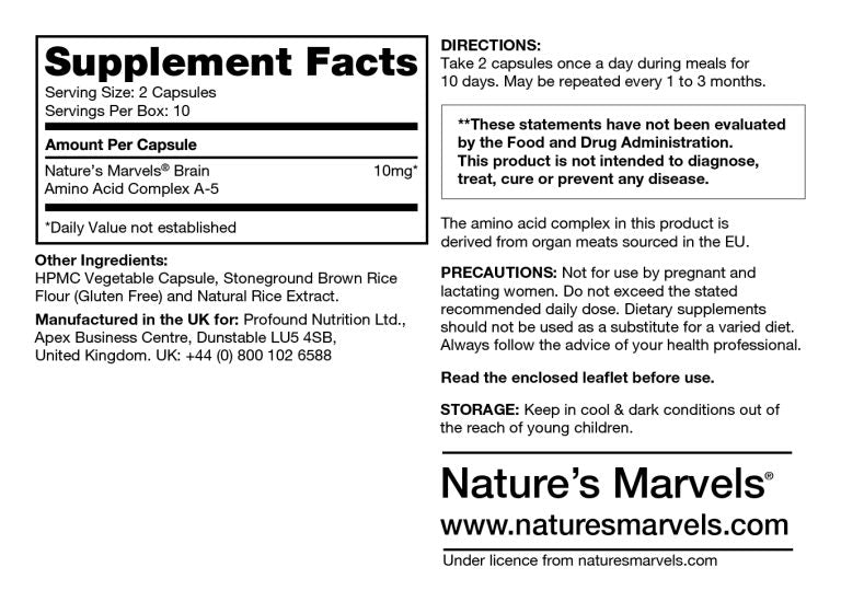Nature’s Marvel’s® Brain Amino Acid complex A-5. HPMC Vegetable Capsule, Stoneground Brown Rice Flour (Gluten Free) and Natural Rice Extract.