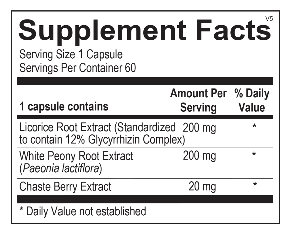 Each capsule includes 200 mg licorice root extract, 200 mg Paeonia lactiflora root extract and a 20 mg clinical dose of chaste berry extract to promote overall female hormone balance.
