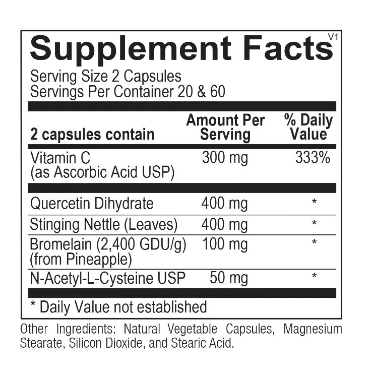 The formula includes quercetin, bromelain, stinging nettles leaf, and N-acetyl cysteine. The powerful combination actively promotes healthy nasal and sinus passages for individuals with elevated histamine and respiratory irritation.