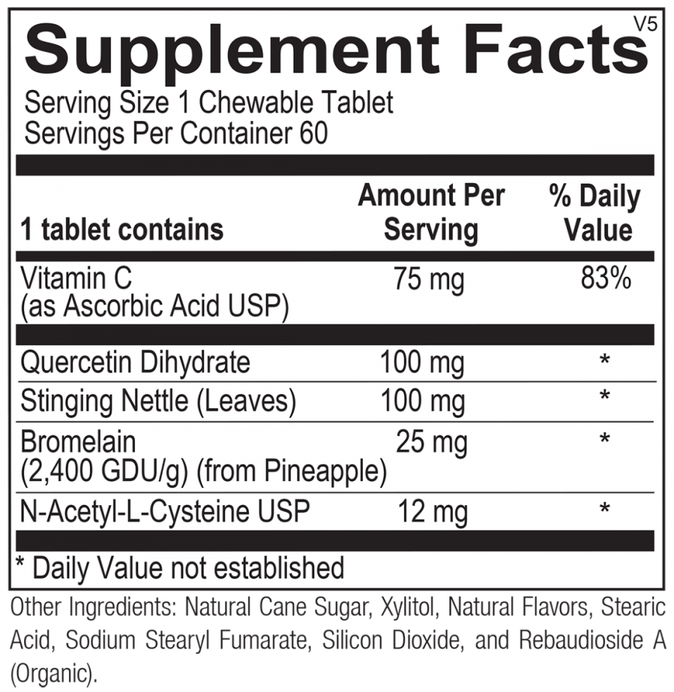 HIST . AID JR is a great-tasting, chewable tablet that includes a targeted blend of flavonoids, antioxidants, proteolytic enzymes and botanicals designed to provide comprehensive support for children with seasonal challenges caused by common environmental allergens. HIST . AID JR includes quercetin, a powerful flavonoid to support healthy histamine levels. It supplies bromelain to enhance the absorption of quercetin and to support mucosal tissue health and stinging nettles leaf to balance hyper-immune response.