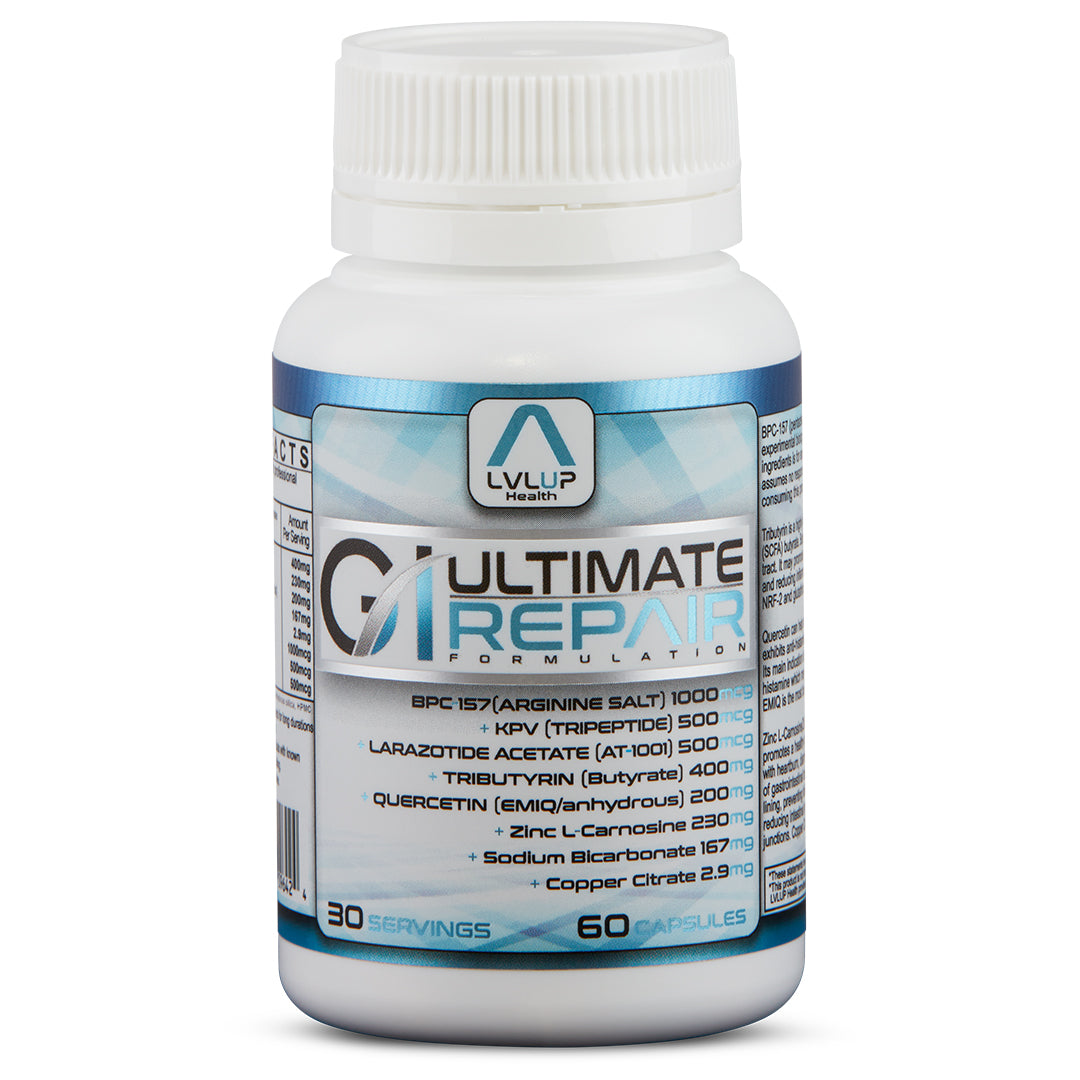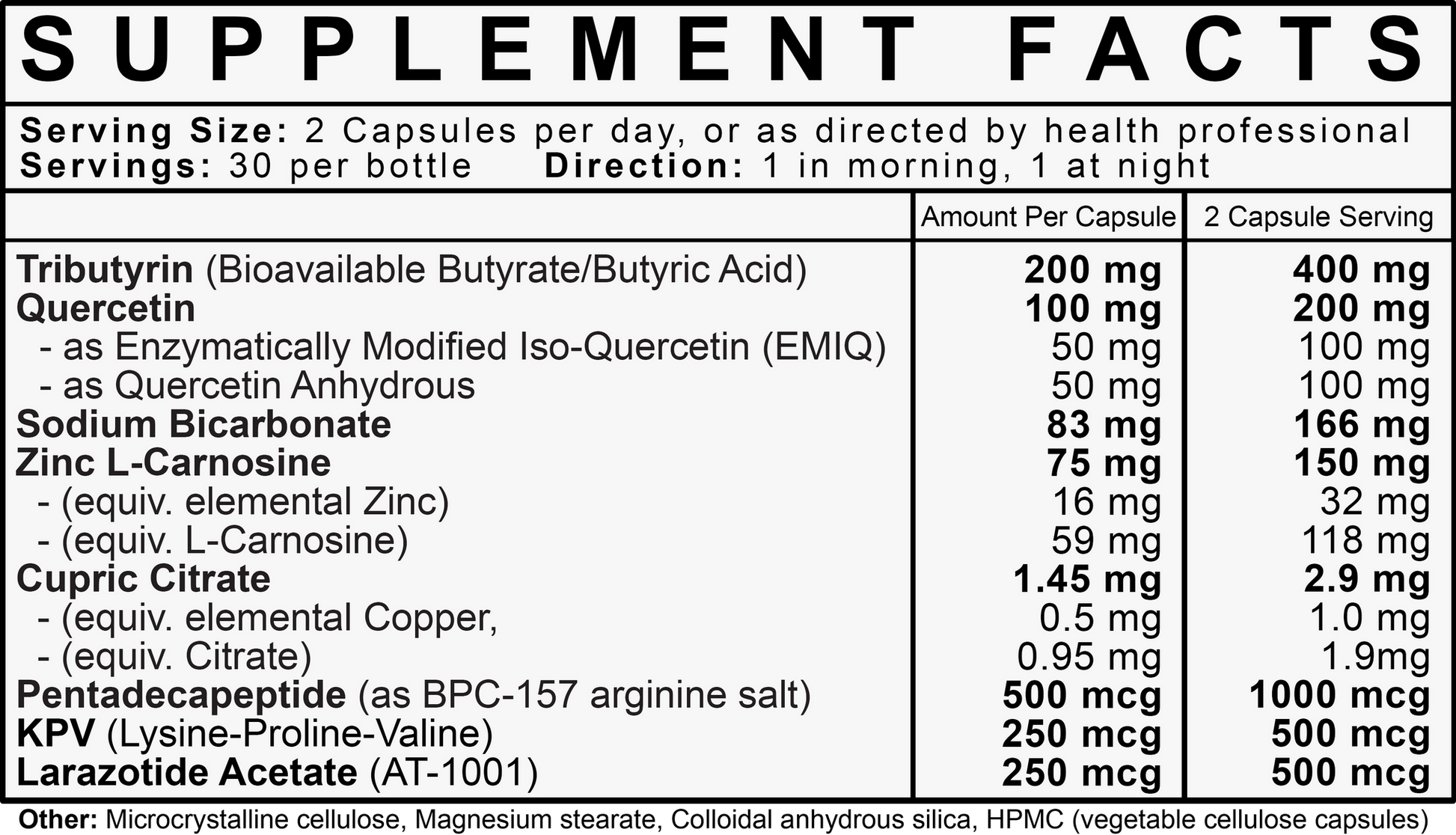 The most powerful gastrointestinal tract healing product on the market featuring peptides BPC-157 (as Arginine salt), Larazotide Acetate AT1001, KPV Tripeptide, and gut healing naturals, Zinc Carnosine, Quercetin (as EMIQ for increased absorption), Tributyrin, Copper (to balance out the high dose of zinc), and Sodium Bicarbonate (stomach acidity buffer to increase peptide absorption).